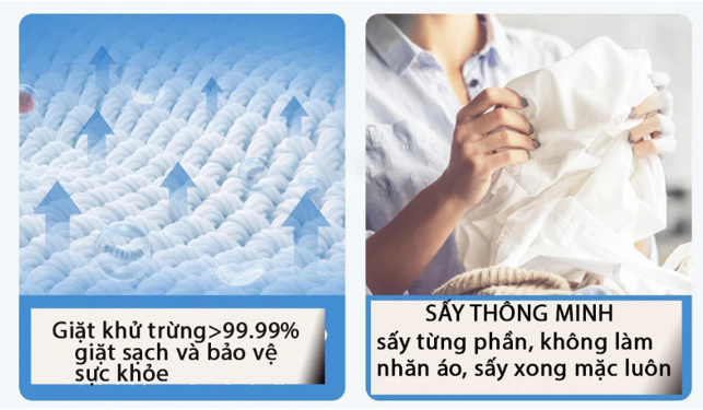 Tích hợp công nghệ hiện đại 2 trong 1 với khả năng giặt và sấy. Bạn không phải lo lắng về vấn đề trời mưa khiến quần áo ẩm ướt hay nhà bạn không gian phơi chật hẹp nữa, quần áo của bạn sẽ khô ngay sau mỗi mẻ giặt, giúp bạn tiết kiệm thời gian và dành thời gian của mình cho những công việc khác. Máy giặt phù hợp cho những hộ gia đình từ 5 -8 người hoặc gia đình ít thành viên hơn nhưng lại có nhu cầu vừa giặt hay sấy với số lượng quần áo nhiều trong mỗi lần giặt giũ, nhất là tiết kiệm thời gian làm khô và không gian phơi khô quần áo với những gia đình có không gian sống nhỏ.