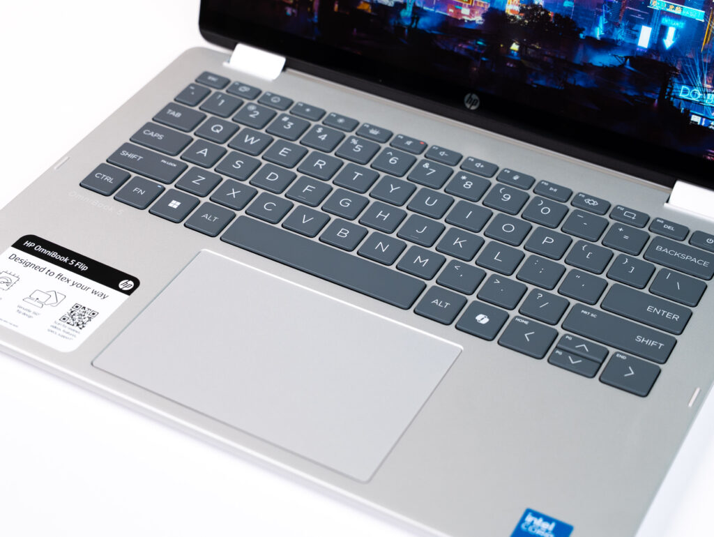 HP OmniBook 5 Flip sở hữu bàn phím tiêu chuẩn với độ nảy tốt, hành trình phím hợp lý, mang lại cảm giác gõ êm tay, thoải mái kể cả khi phải làm việc trong thời gian dài.