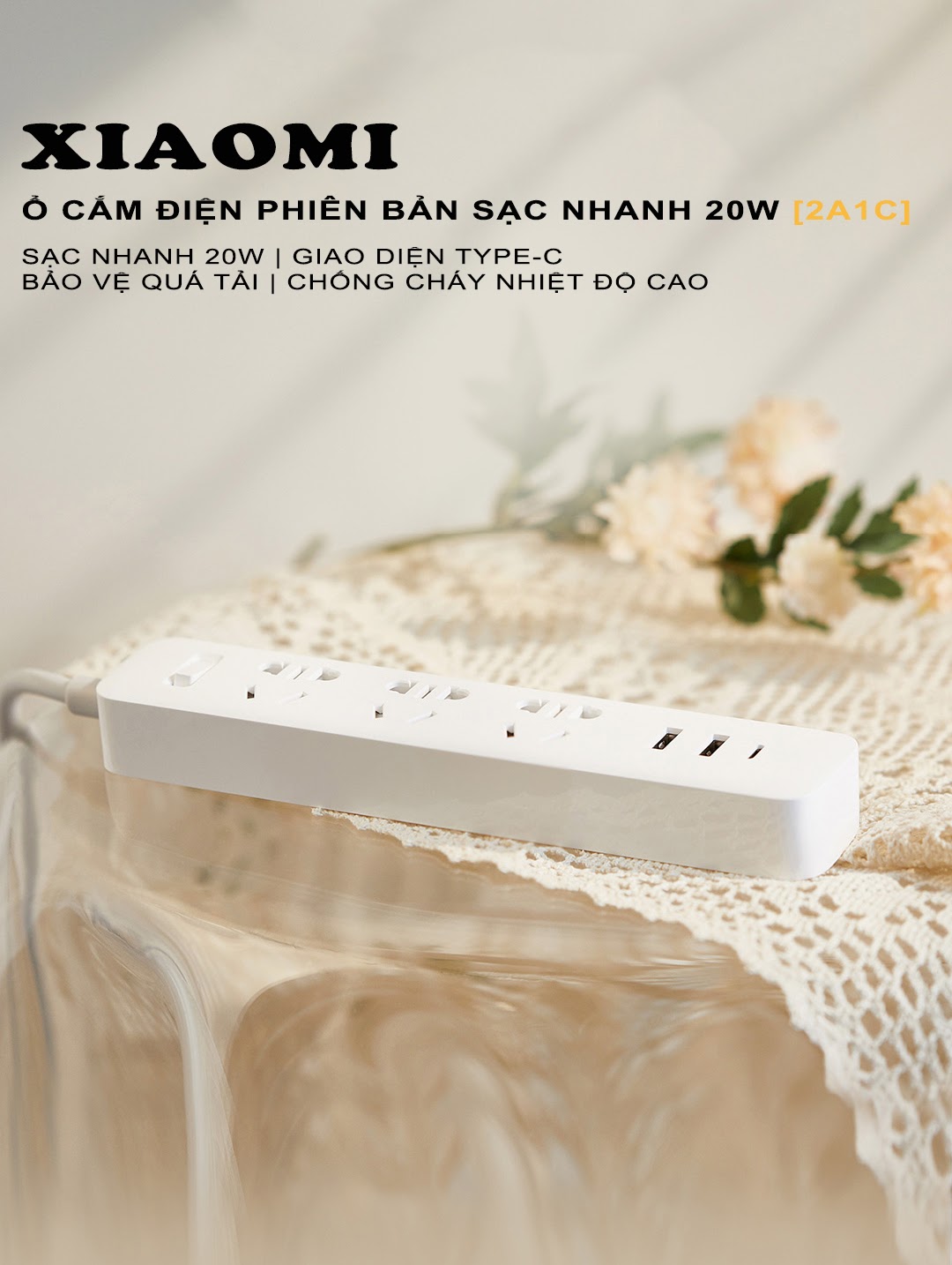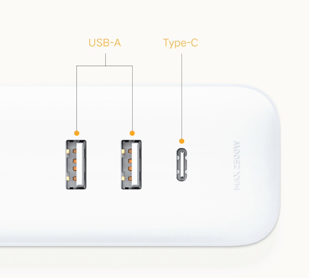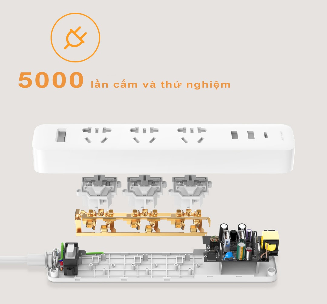Ổ cắm tích hợp sạc nhanh Xiaomi XMCXB05QM là một bản nâng cấp mang thiết kế sang trọng, hiện đại và nhỏ gọn bao gồm 3 jack tiêu chuẩn. Sản phẩm cấu tạo 2 cổng USB-A và 1 cổng Type-C, công suất chịu tải 2500W max, 10A max, 250V, chiều dài dây 1.8m, nguồn vào 100 - 240V, 50/60Hz, 0.5A. Thiết bị được gia công vô cùng tỉ mỉ, cực kì tiện dụng và an toàn với người dùng.