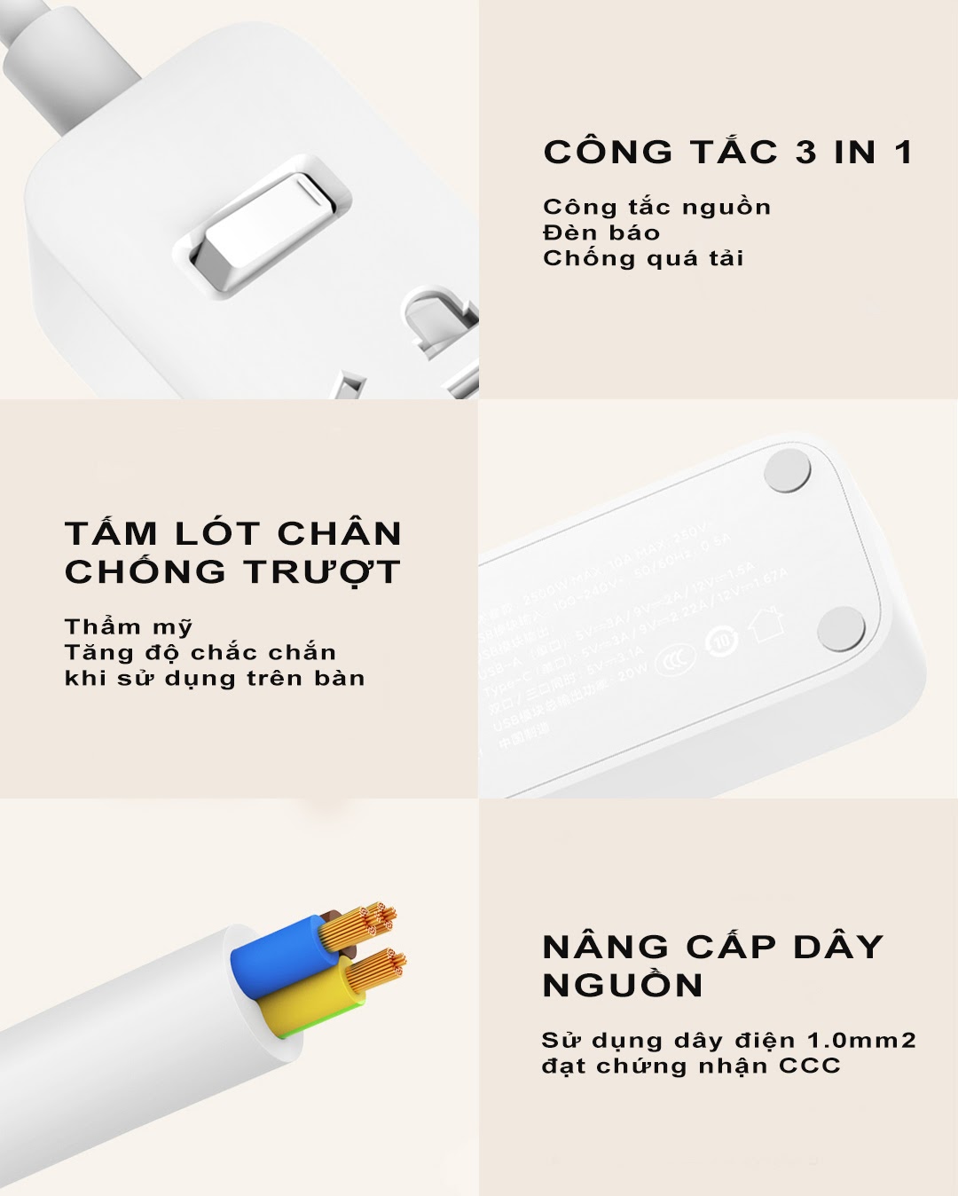 Sở hữu 3 jack tiêu chuẩn, khoảng cách lỗ 41mm tạo nên nhiều không gian trống hỗ trợ dùng nhiều thiết bị dễ dàng, cùng lúc cũng như mang đến sự an toàn, tiện lợi cho người sử dụng.