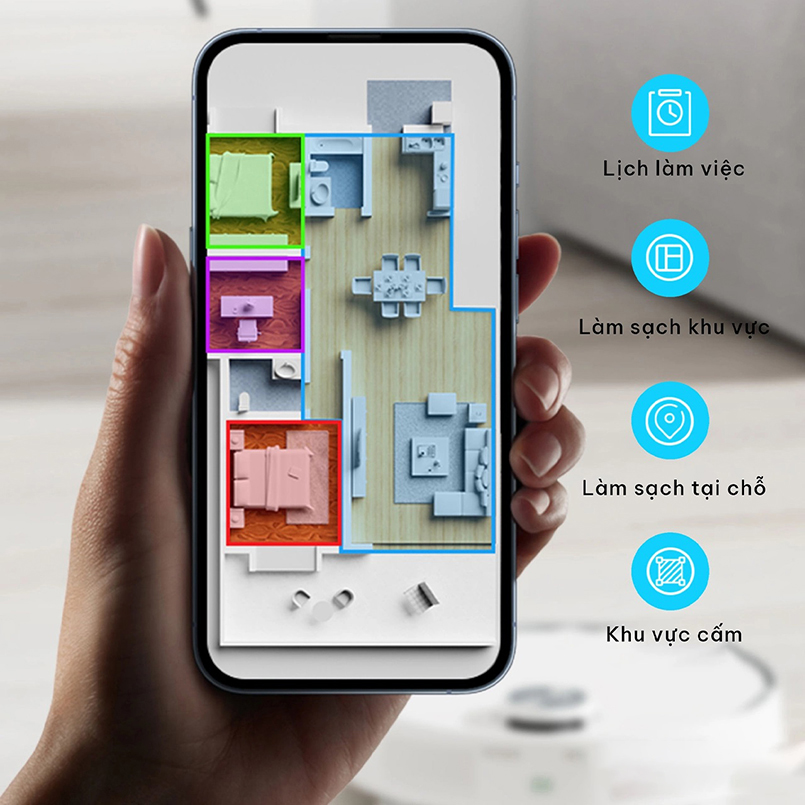 Giao diện tiếng Anh trực quan, thân thiện và dễ thao tác, người dùng có thể điều khiển một số chức năng nổi bật của G10 thông qua app như: tạo khu vực cấm, tường ảo; hẹn giờ, lên lịch để robot tự quét dọn, chế độ lau gấp đôi, tùy chỉnh chế độ lau và hút hoặc kết hợp cả 2; ghi nhớ 3 bản đồ và chia phòng theo mong muốn.
