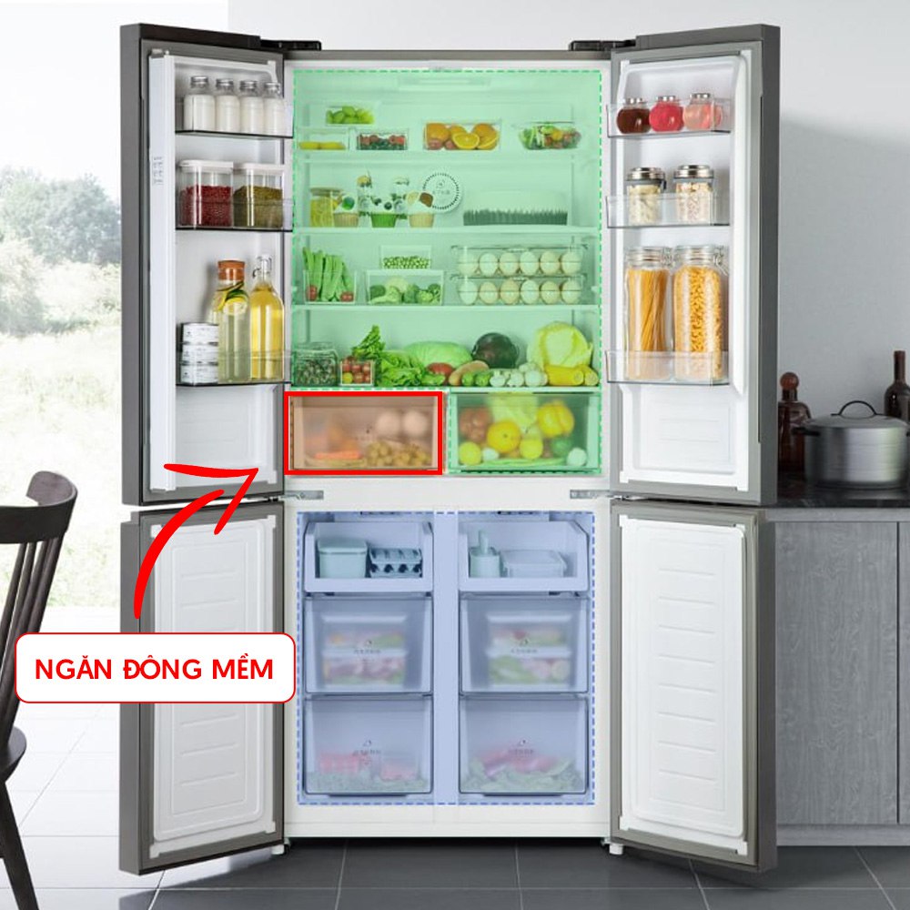 Ngăn đông mềm có thể thay đổi nhiệt độ linh hoạt, thay đổi độc lập so với ngăn mát, Người dùng có thể để các đồ như thịt cá tươi sống, bảo quản 2-3 ngày mang ra sử dụng luôn mà không lo bị hỏng hay phải mất nhiều thời gian giã đông