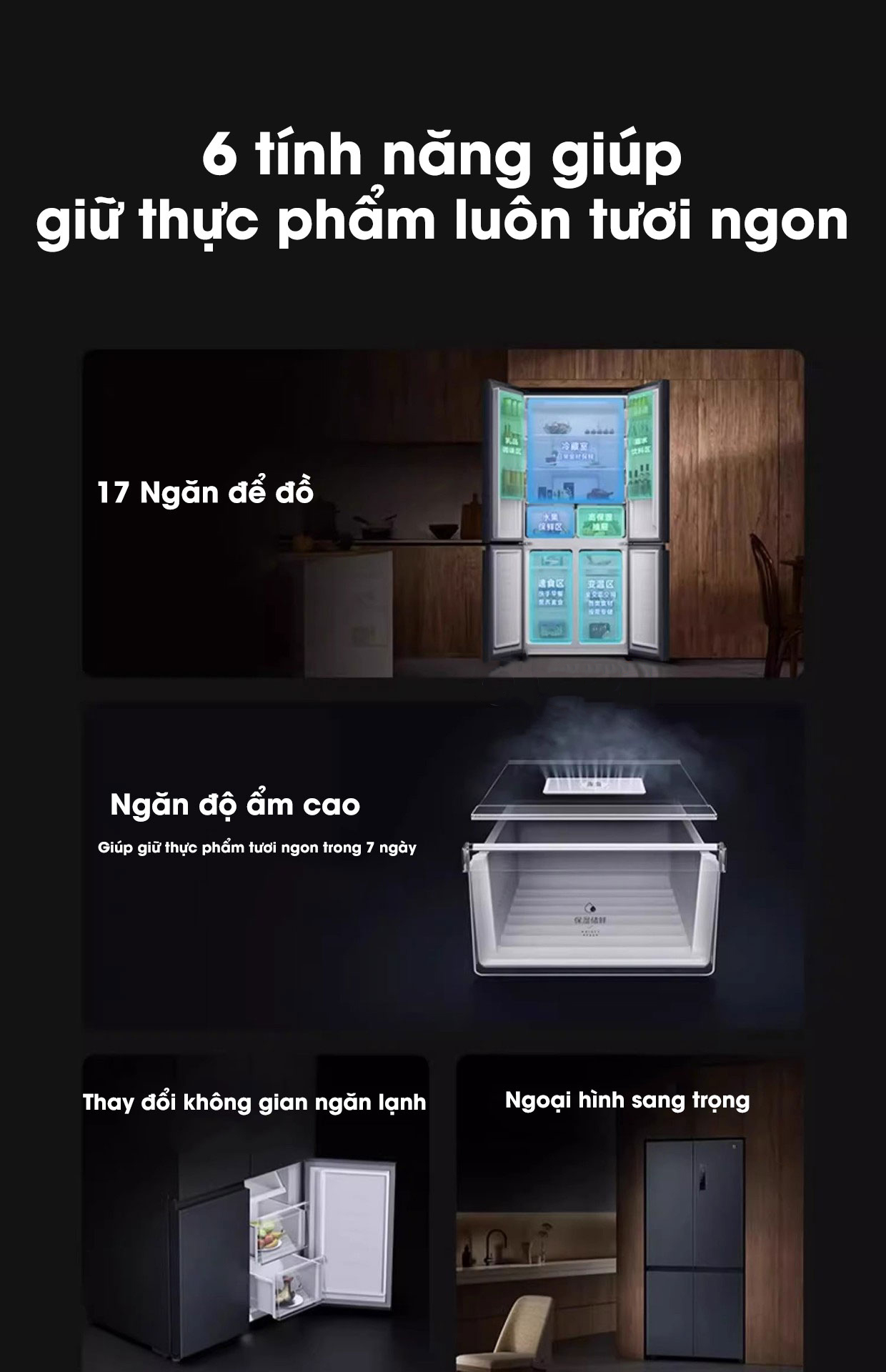 Tủ lạnh Xiaomi Mijia 606L có dung tích lớn, giúp bảo quản được nhiều thực phẩm trong thời gian dài, phân chia các vùng dự trữ đồ thông minh,hiệu quả cao. Đối với các thực phẩm nguyên liệu khác nhau , cũng có các khu vực giữ tươi khác nhau để đảm bảo rằng cả gia đình có thể thưởng thức chế độ ăn giàu dinh dưỡng.