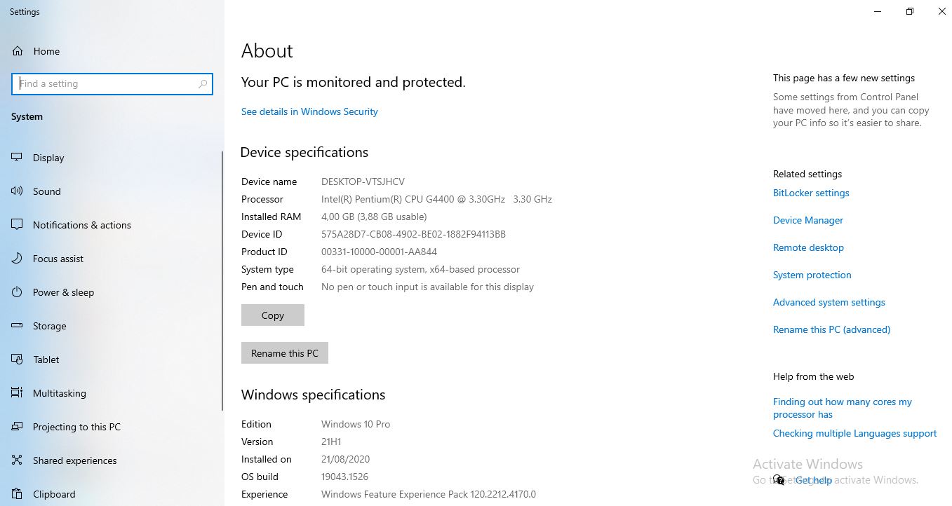 Tại cửa sổ System, bạn sẽ thấy các thông tin cơ bản về cấu hình máy như loại CPU, dung lượng RAM, phiên bản hệ điều hành và trạng thái kích hoạt của Windows.